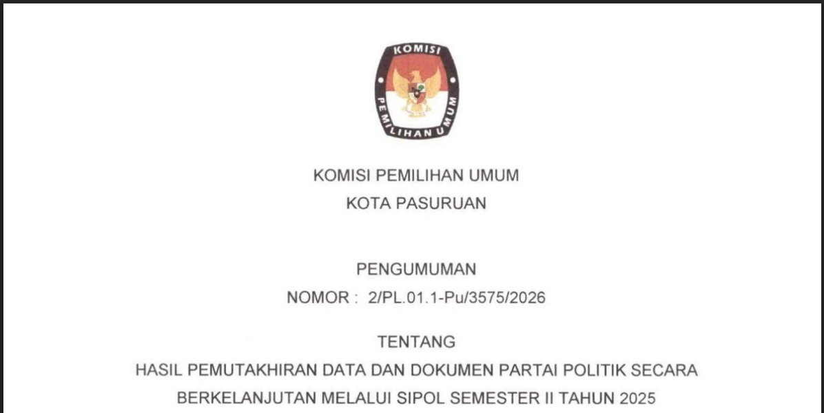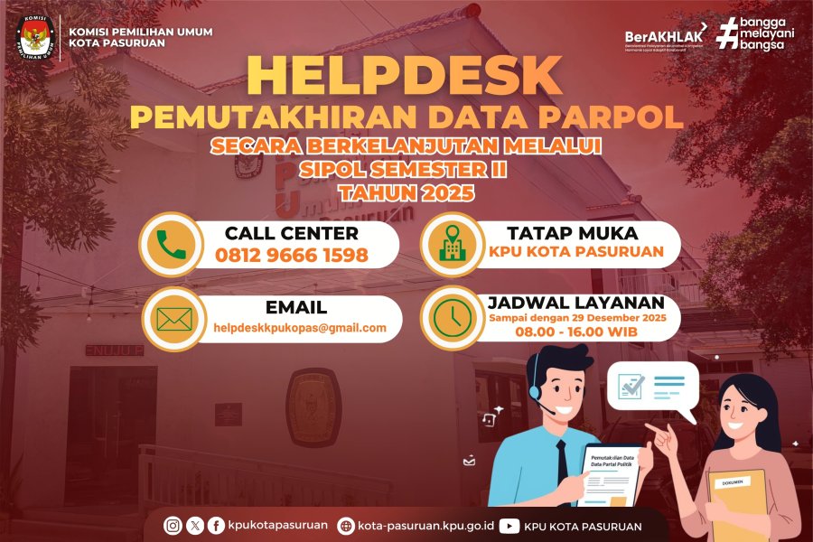 KPU Kota Pasuruan menginformasikan bahwa Pemutakhiran Data Partai Politik secara Berkelanjutan melalui SIPOL Semester II Tahun 2025 sedang berlangsung. KPU Kota Pasuruan membuka layanan Helpdesk Pemutakhiran Data Partai Politik secara berkelanjutan melalui Sipol Semester II Tahun 2025 Jadwal Layanan Helpdesk sampai dengan tanggal 29 Desember 2025 mulai pukul 08.00 - 16.00 WIB Untuk informasi lebih lanjut, silakan hubungi Helpdesk KPU Kota Pasuruan: Sdr. Bill Christian Purba – 0812 9666 1598 ....